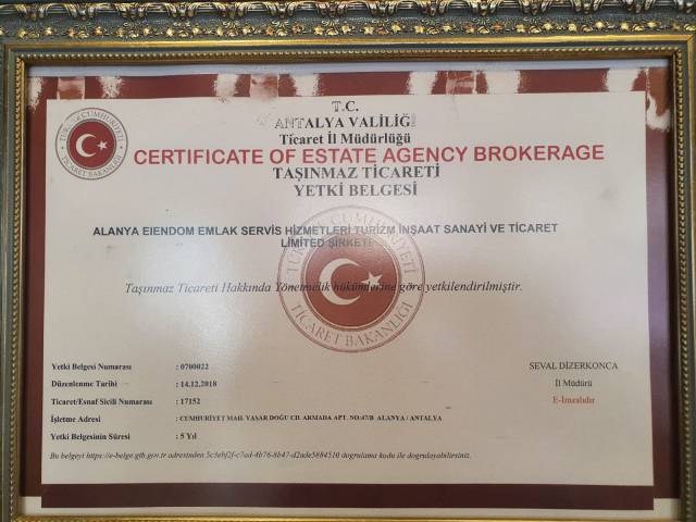 Alanya Eiendom -kiinteistöyhtiö on valtuutettu ja omistaa kaikki tarvittavat asiakirjat Turkissa, mukaan lukien kaupan ja kiinteistömyynnin valtuutukset.